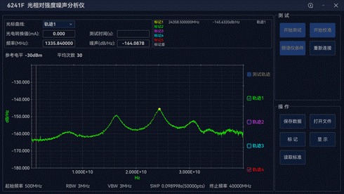 RIN分析仪具备友好的用户交互界面,图2为本方案实际RIN测试结果图示例。软件可设置不同的测试条件,便于用户分析全频域、分频段的RIN指标。40GHz分析带宽兼顾超高速应用场景,思仪的校准技术自动剥离环境噪声及系统噪声,实现高精度高重复性的RIN测量,-157dBc/Hz(@1mW光输入)噪底接近量子极限水平。