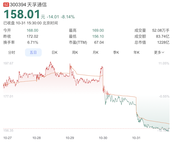 可以看到,10月30日和31日两天,中际旭创股价下跌9%,市值蒸发了530亿元;新易盛股价下跌了15%,市值蒸发了614亿元;天孚通信股价下跌了19%,市值蒸发了284亿元。