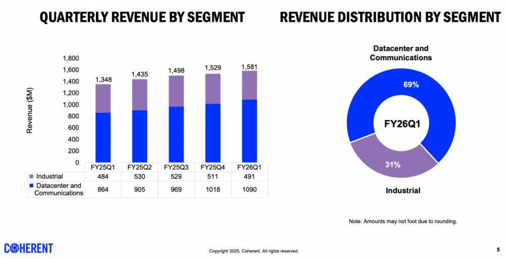 数据显示,2026财年第一季度业绩,Coherent数据通信和通信业务收入为10.9亿美元,同比增长26%,占收比为69%。