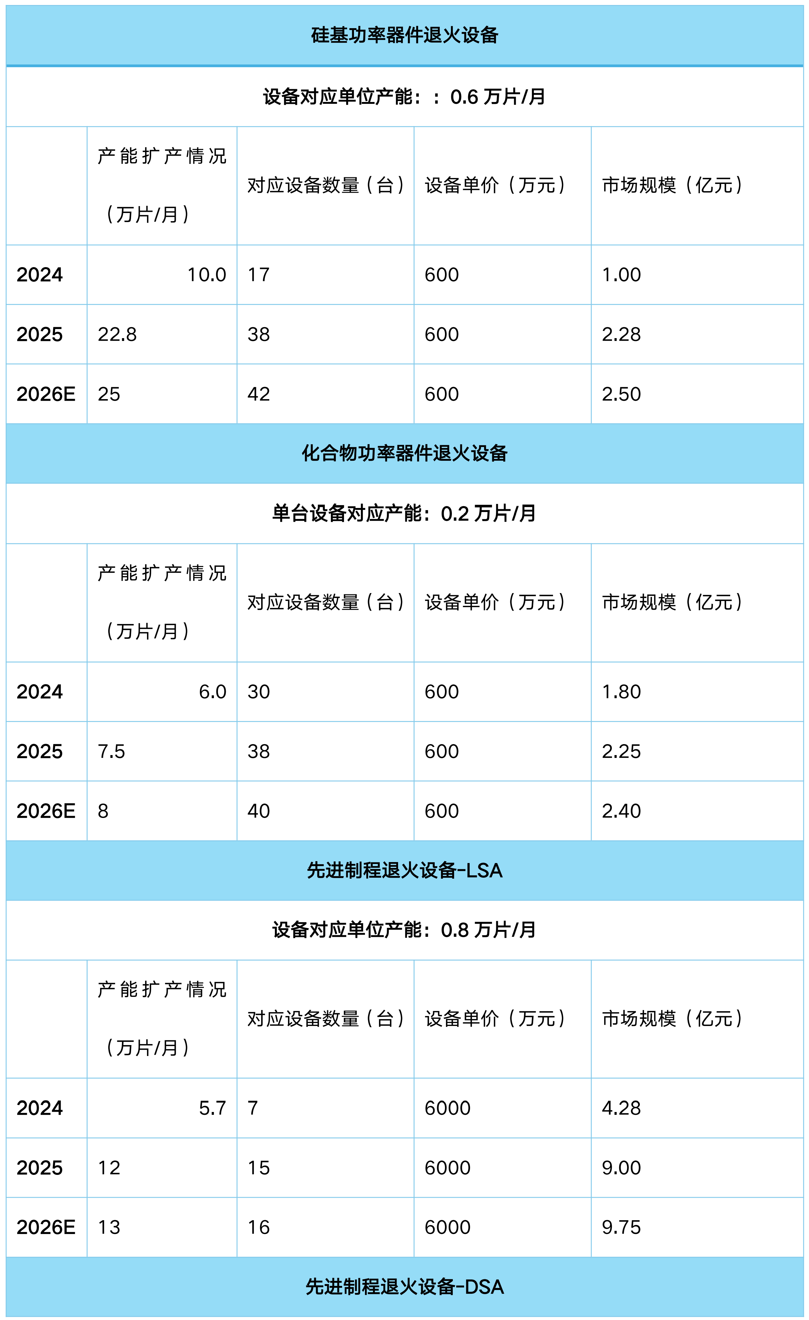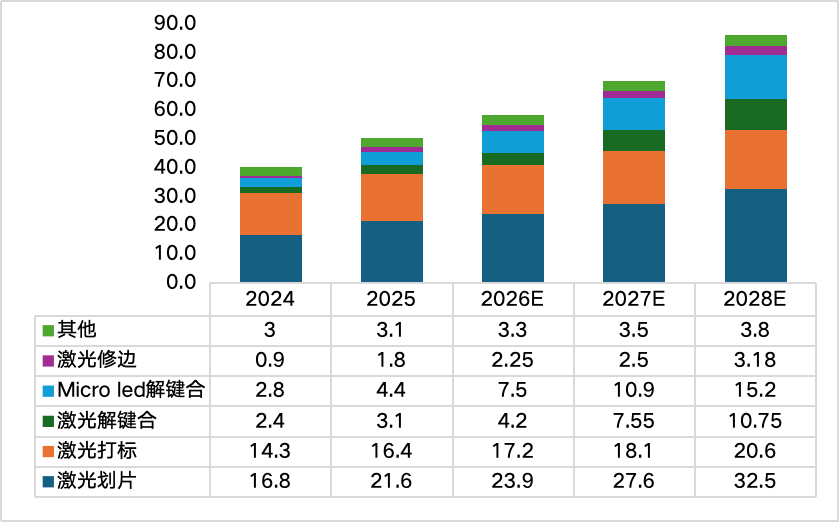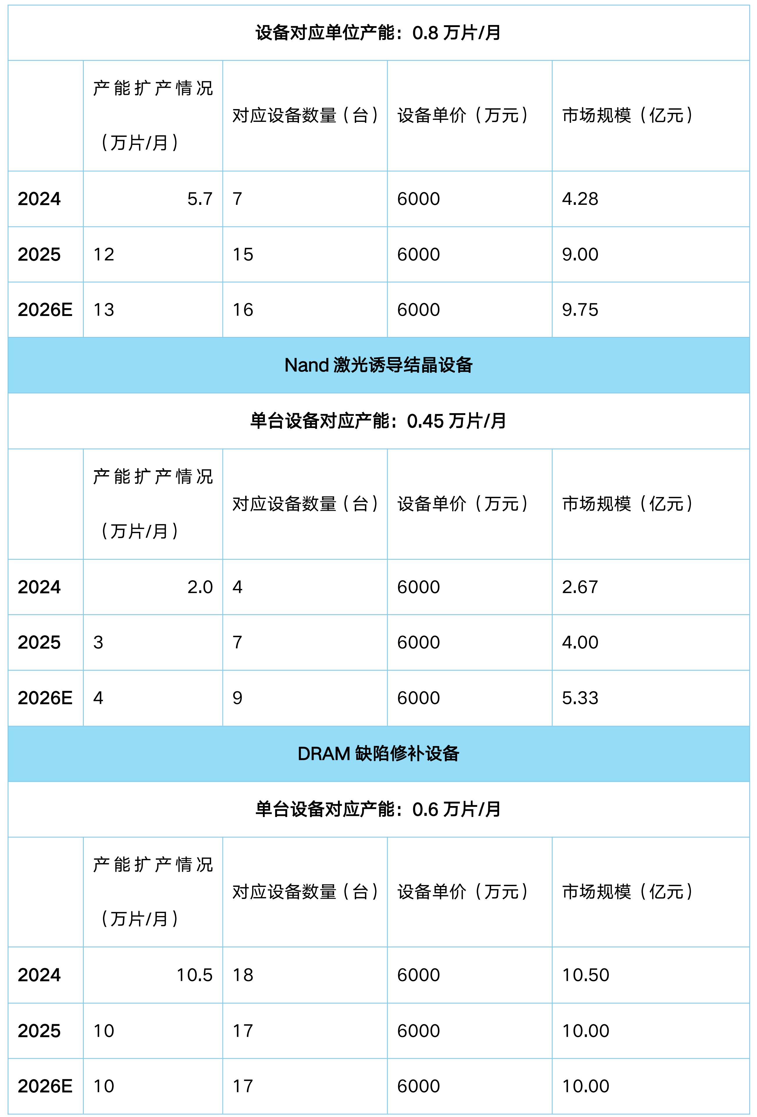 根据前文分析,目前应用于前道晶圆制造的半导体激光设备主要为激光退火设备和激光改性设备,其中根据应用产品不同激光退火设备又可分为功率器件退火设备、逻辑芯片退火设备和存储器退火设备;激光改性设备可分为Nand激光诱导结晶设备和DRAM缺陷修补设备。根据目前国内晶圆厂扩产节奏(2026-2028年预测按设计产能平均分配),具体市场如下: