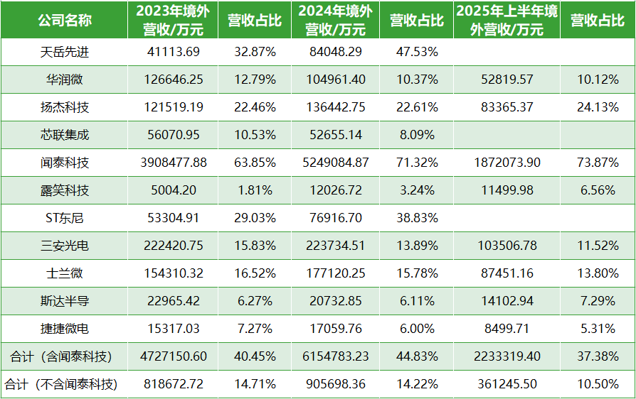 2023年至2025年上半年,A股11家三代半上市公司合计境外营收分别为472.72亿元、615.48亿元、223.33亿元,整体保持增长韧性。2024年同比增速为30.2%,2025年上半年受闻泰科技影响,整体增速降至-18.42%;若剔除闻泰科技影响,其余10家公司2024年、2025年H1境外营收合计分别同比增长10.63%、10.02%。
