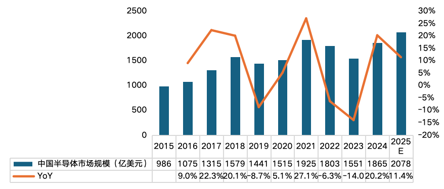 当前,国内半导体市场正处于快速发展的中前期成长阶段,展现出与海外市场不同的发展规律。海外市场的半导体行业已经进入一个较为成熟的周期性成长行业,而国内市场则呈现出更为迅猛的发展势头。在这一背景下,国产化替代成为推动我国半导体产业快速发展的核心驱动力。2024年,中国半导体行业在国家政策的大力支持和市场需求的双重推动下,展现出强劲的复苏势头。根据WSTS统计,2024年中国半导体市场销售额达到1865亿美元,占全球市场31.9%。展望未来,在政策的大力支持、行业周期的反转、国产替代的加速推进,以及数据中心、AI及端侧设备等下游市场强劲增长的多重驱动下,特别是端侧AI领域的快速发展——即在手机、PC、摄像头、智能家居设备等终端设备上AI技术的广泛应用和深度参与,中国半导体产业有望在下一阶段迎来更好的表现。预计2025年中国半导体市场将增长11.4%,销售额将达到2078亿美元。