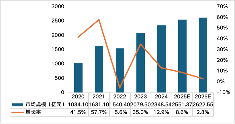 从现阶段国内半导体设备厂商产品覆盖情况来看,国产设备厂商正积极布局半导体前道设备市场。中国大陆半导体前道设备2025年国内晶圆产线扩产叠加国产替代增加设备储量等因素,拉动我国半导体前道设备市场迅猛增长8.6%达2551.3亿元,预计2026年达2622.5亿元。