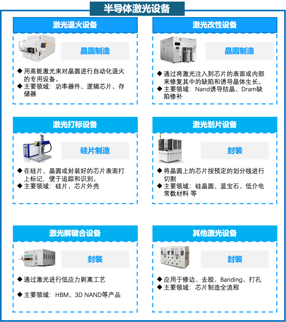 目前根据应用原理和应用工艺环节的不同,可将半导体激光设备分为激光退火设备、激光材料改性设备、激光打标设备、激光划片设备、解键合设备和修边(Trimming)设备等。