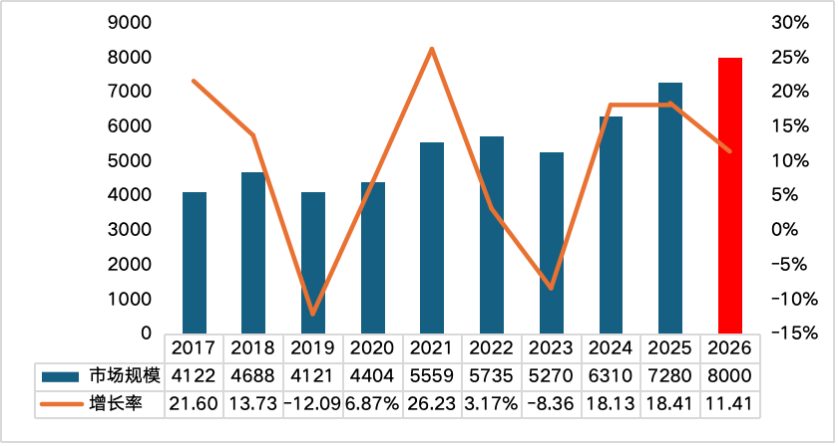 图 2 2017-2026年全球半导体市场规模(亿美元)