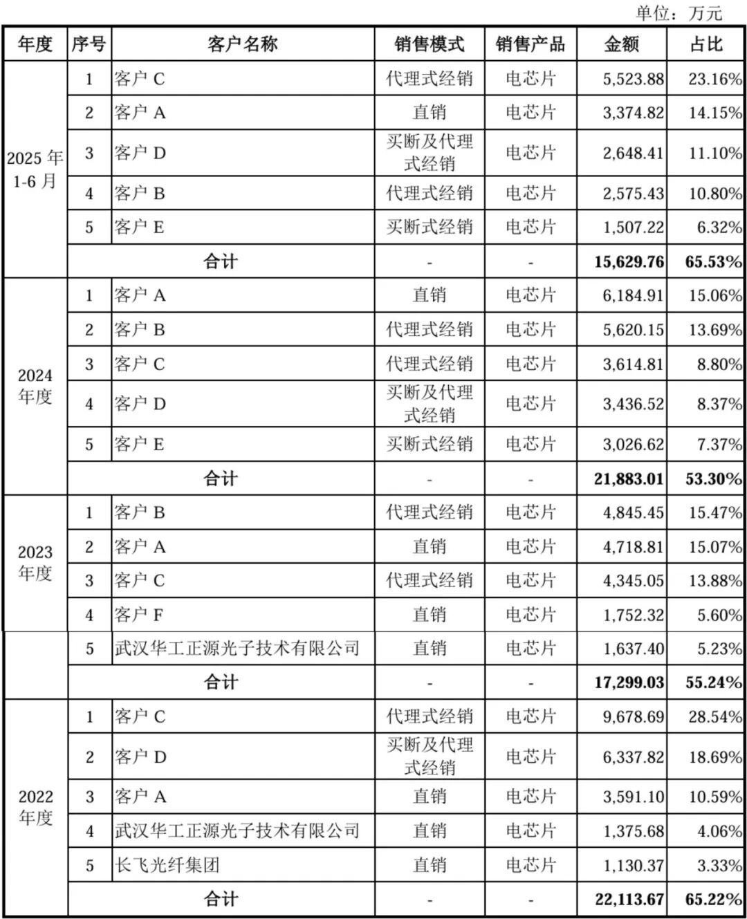 2022年、2023年、2024年、2025年1-6月,优迅股份向前五大客户销售金额占总销售金额的比例分别为65.22%、55.24%、53.30%、65.53%,客户集中度较高。