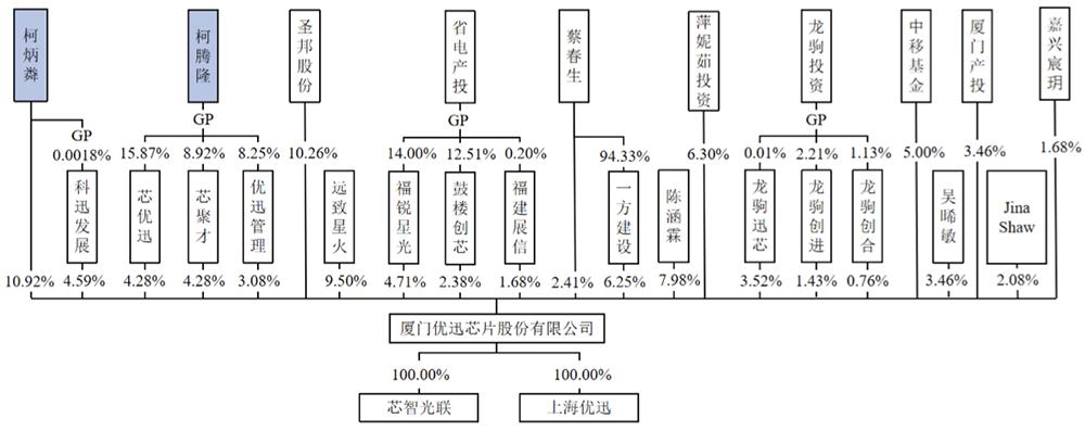 其董事长柯炳粦直接持股10.92%股份,通过担任科迅发展的执行事务合伙人间接控制4.59%表决权,共控制15.51%表决权;柯腾隆担任员工持股平台芯优迅、芯聚才、优迅管理的执行事务合伙人,并通过上述三个员工持股平台控制11.63%表决权。柯炳粦与柯腾隆合计控制27.13%表决权。
