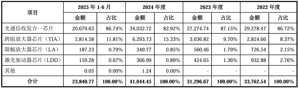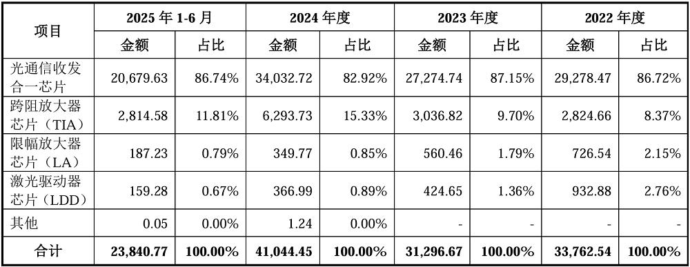 优迅股份的主营业务收入主要来自于光通信收发合一芯片产品的销售,这一产品贡献了其8成以上的营收。优迅股份的其余产品包括跨阻放大器芯片、限幅放大器芯片、激光驱动器芯片等。