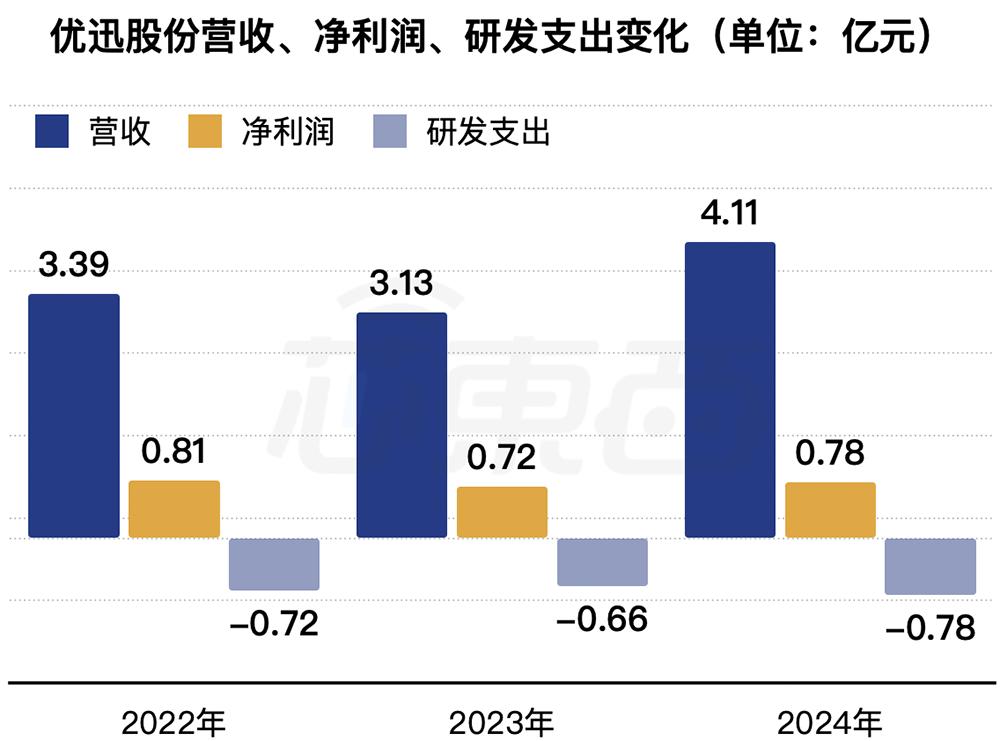 2022年、2023年、2024年,优迅股份的营收分别为3.39亿元、3.13亿元、4.11亿元,净利润分别为0.81亿元、0.72亿元、0.78亿元,研发费用分别为0.72亿元、0.66亿元、0.78亿元。