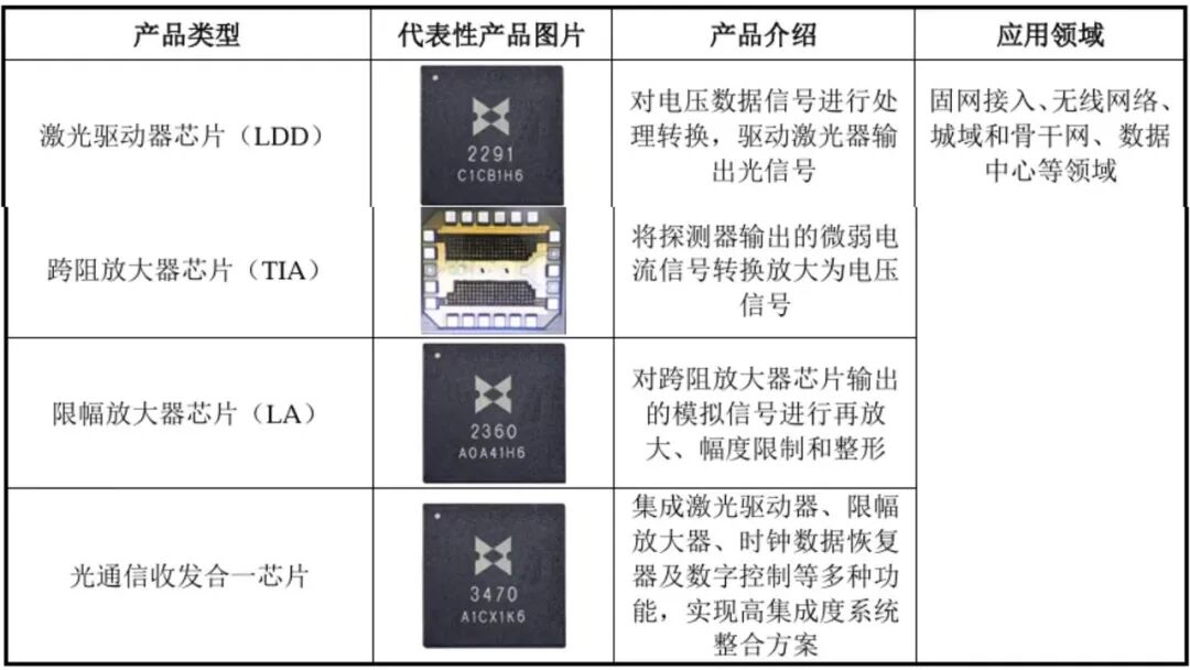 该公司基于对激光驱动器芯片(LDD)、跨阻放大器芯片(TIA)、限幅放大器芯片(LA)、光通信微控制器芯片(MCU)及时钟数据恢复器(CDR)、模数转换芯片(ADC)、数模转换芯片(DAC)等光通信电芯片核心系列产品与技术的深度理解,可结合市场需要为客户量身定制套片解决方案。