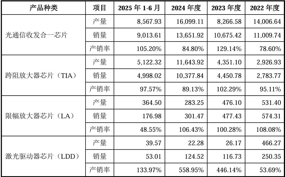 报告期内,优迅股份根据市场情况备货及销售,产销率存在一定的波动。其激光驱动器芯片主要系成熟产品,历史备货较多,2023年、2024年、2025年1-6月份产量低于销量,产销率较高。