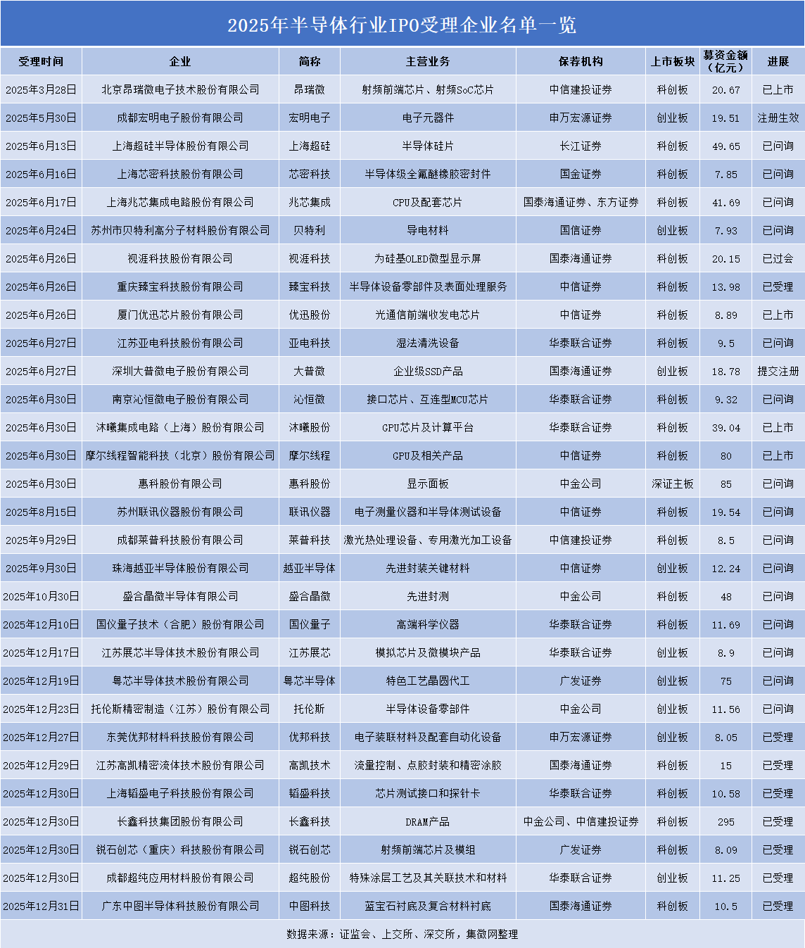 从募资规模分布看,头部企业展现出强劲的融资需求,也体现出行业融资结构的分化特征。据集微网统计显示,30家受理企业合计拟募资985.86亿元,平均单家募资额达32.86亿元。