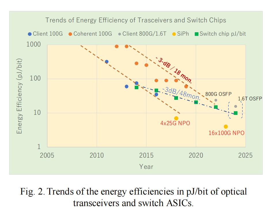 图 2 绘制了光收发器和超大规模数据中心常用的电交换机专用集成电路 (ASIC) 的能效(单位为 pJ/bit)随时间的变化曲线。通过与光收发器的趋势进行比较,发现交换机 ASIC 的可扩展性不如光收发器,这表明瓶颈在于交换机而非收发器。令人惊讶的是,光收发器的能效已经赶上了摩尔定律的步伐,基于硅光子学的近封装/共封装光学器件的能效已经超过了 5 pJ/bit,而交换机 ASIC 的能效提升却明显缓慢。