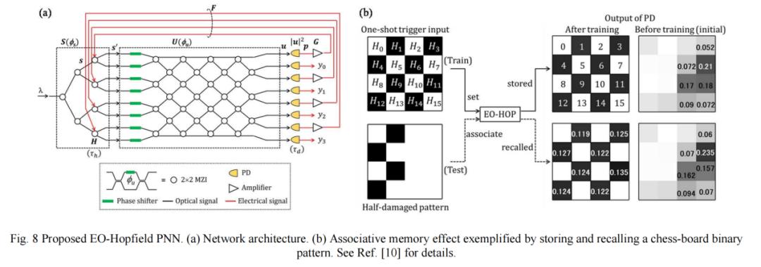 图 8(a) 显示了我们提出的架构,其中马赫-曾德尔干涉仪 (MZI) 作为非线性神经元,将输入数据和反馈信号编码到输入的单频连续波 (CW) 光(记为 λ)上。图 8(b) 显示,经过训练后,即使对于半损坏的输入模式,也能回忆起存储的模式,这表明了霍普菲尔德网络特有的联想记忆效应。