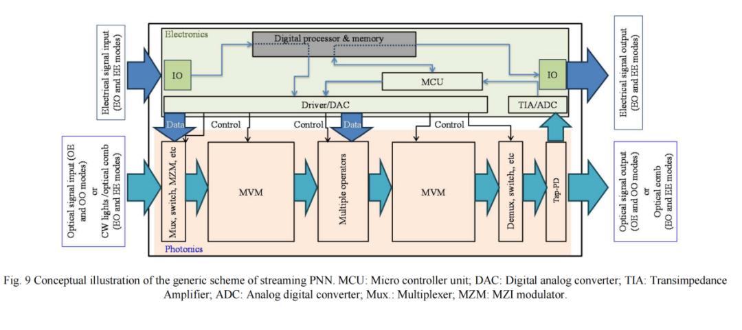 由于运行 PNN 需要不可忽略的开销,因此必须对整个系统进行彻底评估和整体优化。另一方面,PNN 的固有优势是低延迟、高速度、低能耗等。为了充分发挥这些优势,PNN 作为流式处理器,同时具备电域和光域 I/O 时,运行效果最佳。流式 PNN 的概念如图 9 所示。通过该方案,PNN 可以同时在电域和光域中流式处理数据,从而无缝集成到数字基础设施中。