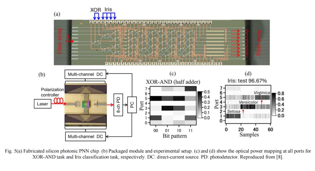 图5(a)和5(b)分别展示了我们开发的硅光子芯片和实验装置。我们使用BFO(bacteria foraging optimization)和前向差分两种算法在芯片上进行了训练,并在图5(c)中展示了它们对多个布尔逻辑进行分类的有效性,并在图5(d)中展示了它们对鸢尾花数据集的高精度分类。该PNN仅通过无源光子电路中信号的物理传播即可完成计算,从而保证了低功耗和低延迟计算。