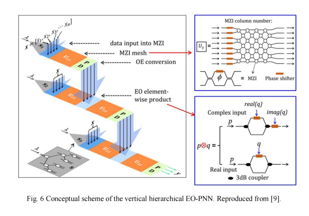 基于标准CMOS制造技术的硅光子器件具有高均匀性和高良率,这对于实现光子神经网络(PNN:photonic neural networks )至关重要。在PNN中,集成了大量的马赫-曾德尔干涉仪(MZI),形成网状拓扑结构,并在光域中执行矩阵-向量乘法(MVM:matrix-vector multiplications)。PNN上的MVM过程本身速度极快,且不消耗能量,可以显著提升人工智能(AI)的计算能力。因此,人们期望PNN能够分担GPU等高能耗数字处理器的计算任务。然而,PNN缺乏良好的非线性激活函数,而非线性激活函数是AI计算中另一个重要的功能。