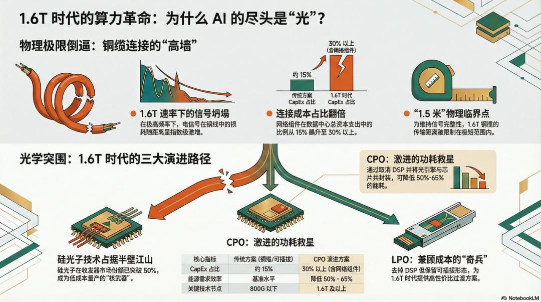 在数据中心内部,一场无声的革命正在发生。长期以来,铜缆凭借其低廉的成本和高可靠性,统治着短距离数据传输。然而,当信号速率跨入 1.6T 门槛,铜的电阻特性成了不可逾越的物理高墙。