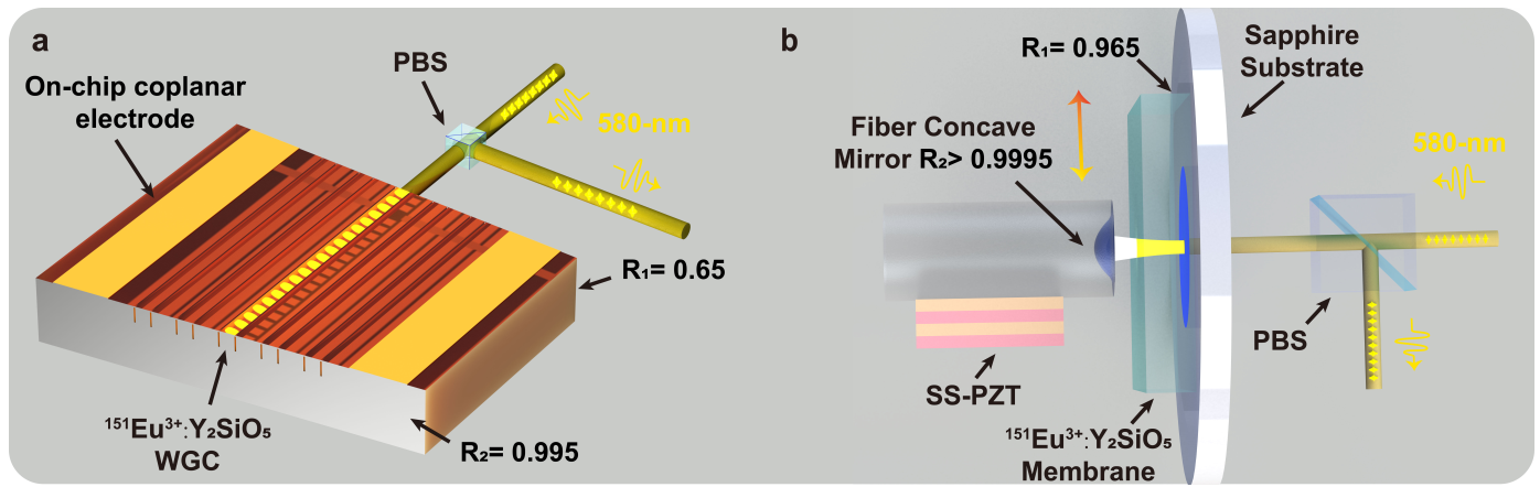 面对这一挑战,中国科大团队独辟蹊径,构建了基于“阻抗匹配微腔”的全新量子存储架构(图1)。研究团队基于掺铕硅酸钇晶体设计了两种新型的微腔增强量子存储器:一种是利用激光在晶体内部雕刻光波导,镀膜形成波导腔;另一种则将晶体薄膜耦合开放式的光纤微腔。