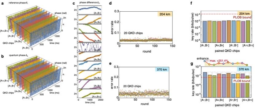 a,b,c 长光纤信道中的相位涨落 d,e 误码率情况 f,g 20个QKD芯片用户最终成码表现