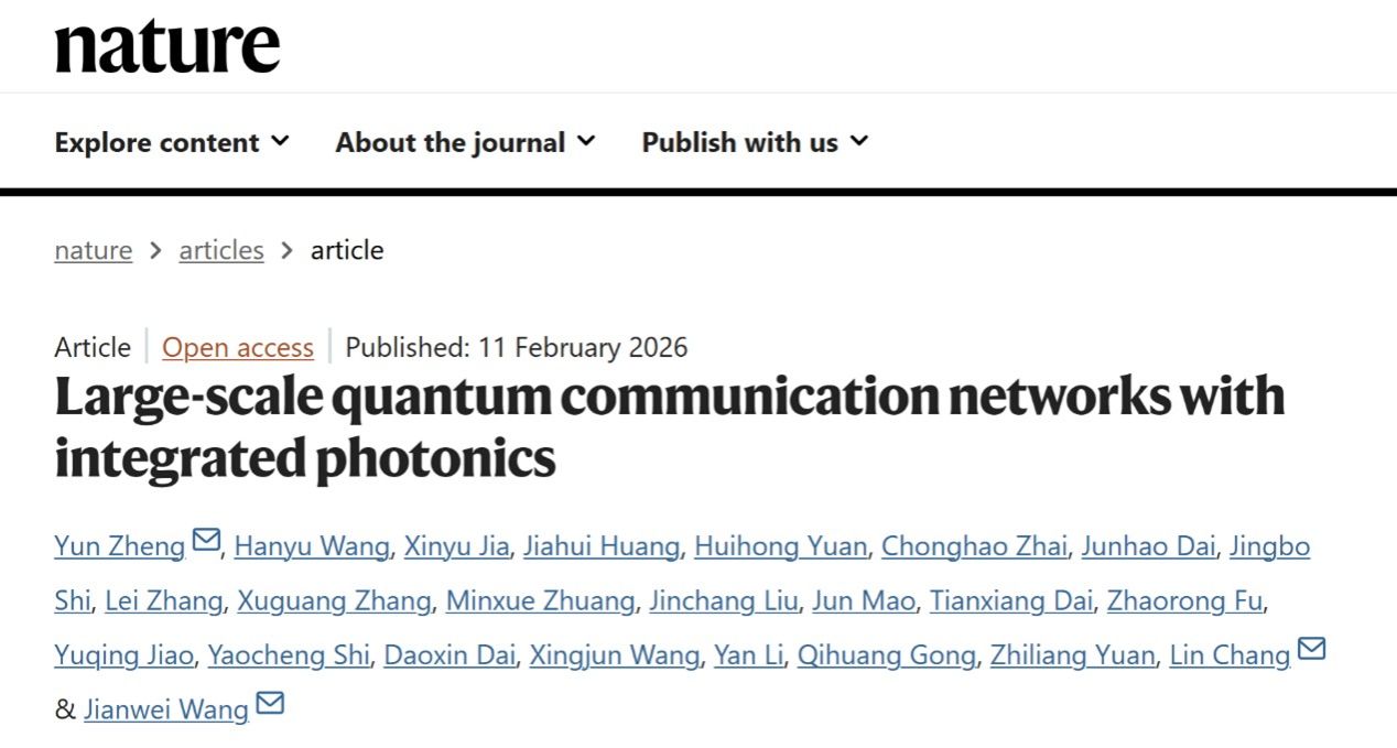 2026年2月11日,电子学院常林研究员团队与北京大学物理学院现代光学研究所王剑威教授、龚旗煌教授团队在国际顶级学术期刊《自然》上发表了题为“基于集成光量子芯片的大规模量子通信网络”(Large-scale quantum communication networks with integrated photonics)的突破性研究成果。研究团队成功研制出全功能集成的光学微腔光频梳光源芯片与高性能量子密钥发送芯片,并在此基础上构建了全球首个基于集成光量子芯片的大规模量子密钥分发网络——“未名量子芯网”。该网络包含20个用户量子芯片节点与1个服务器芯片节点,总通信距离达3700公里,在芯片用户规模与空间跨度上均达到国际领先水平。研究还进一步验证了基于氮化硅和磷化铟的材料体系在光量子芯片制造中的优越性,具备晶圆级加工的高良率、高性能与强扩展性特点,为实现低成本、大规模制备奠定了工艺基础。此项突破为未来建设覆盖更远距离、容纳更多用户、支撑更大规模的实用化量子保密通信网络提供了坚实的芯片级解决方案。