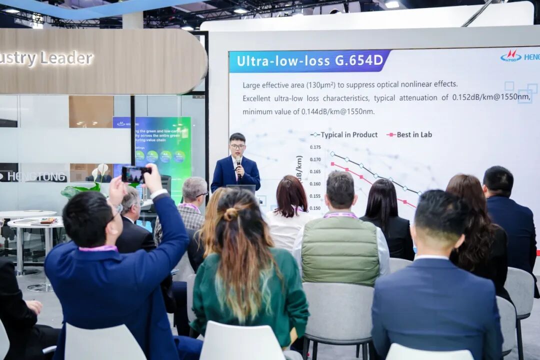 围绕大会主题与AI算力基础设施建设热点,亨通光电此次还带来了以“高速、低耗、全栈、绿色”为核心的创新产品与一体化解决方案,全面覆盖算力中心内部互联、跨域数据传输以及绿色能效优化等关键场景。现场同步展示了空芯光纤、超低损光纤、光纤监测、高速光模块、工业PON、海洋装备等核心产品,彰显了其从底层技术到整网解决方案的全面布局。