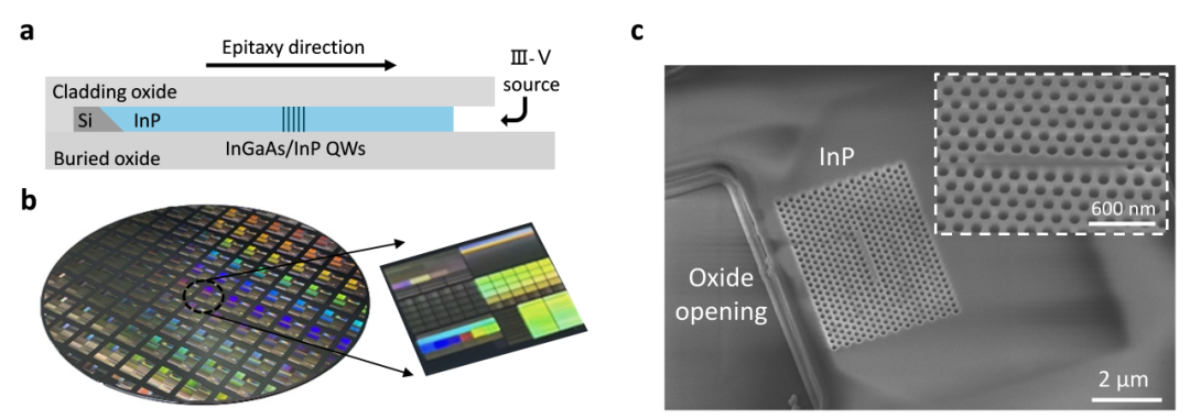 硅基单片集成:在金属有机物化学气相沉积系统(MOCVD)中,基于商业 SOI 外延模板开展与硅波导层共平面的水平侧向选区外延,实现硅基高质量InP薄膜晶圆级生长。生长得到的磷化铟薄膜上下由氧化硅包裹,无需悬空结构即可实现强光场限制,大幅提高了器件的结构稳定性。化合物半导体与硅层共平面等厚度,易于实现二者间高效光耦合。