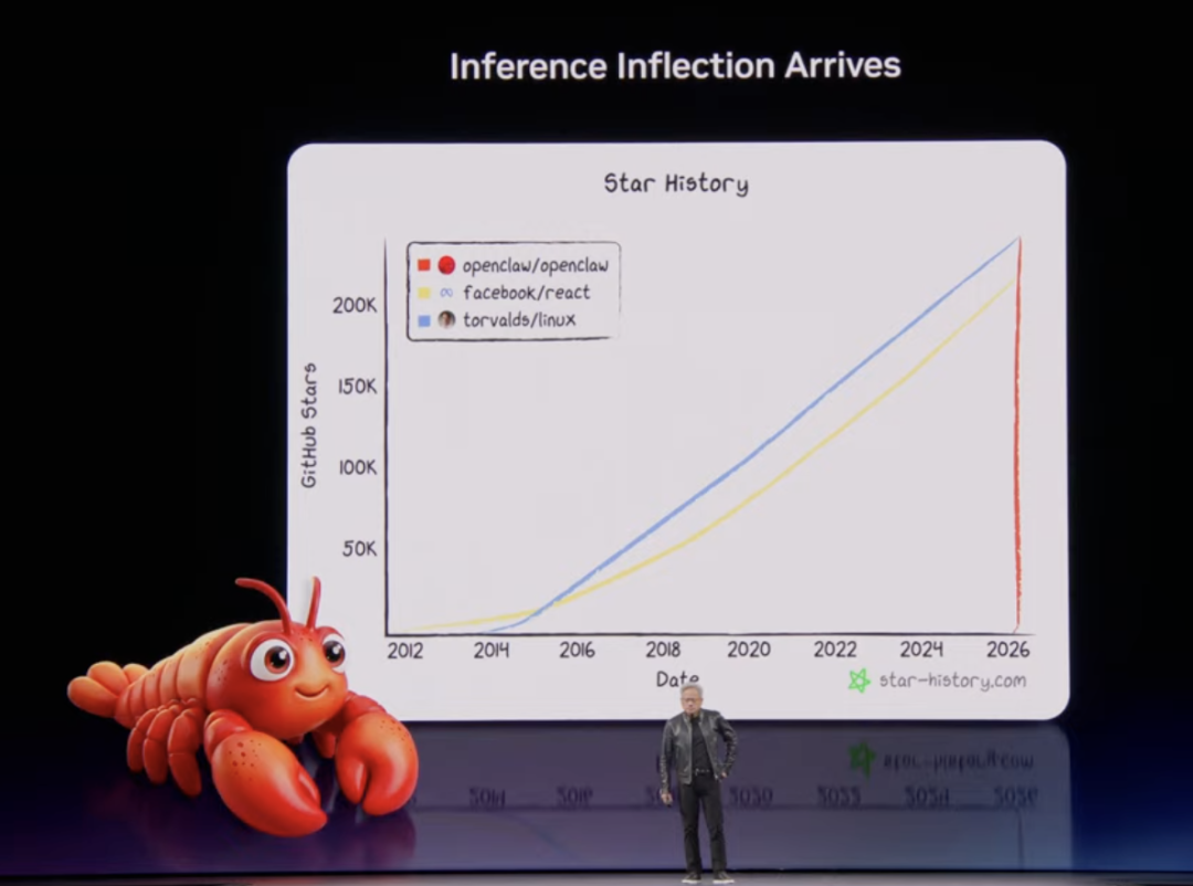 发布会的最后一部分,老黄画风一转,开始聊人类历史上最受欢迎的开源项目OpenClaw。