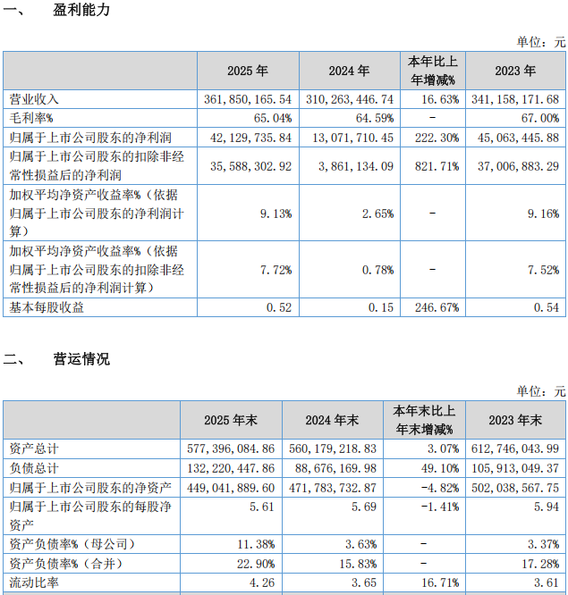 2025年,公司基本每股收益为0.52元,较上年同期增长246.67%;加权平均净资产收益率达9.13%,较上年同期增加6.48个百分点。毛利率为65.04%,较上年同期的64.59%略有提升。