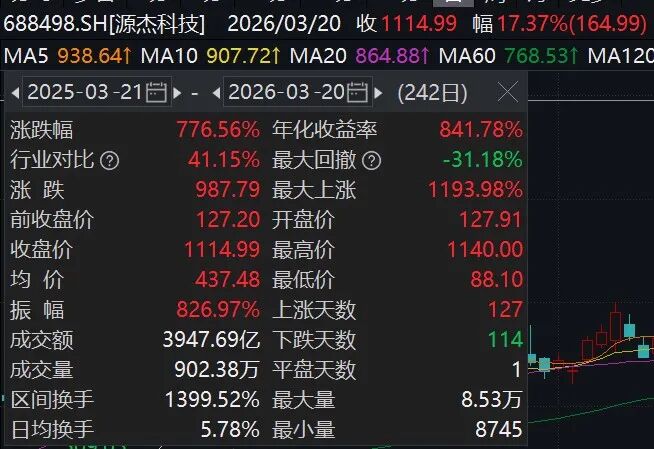 3月20日早间,主营光芯片的半导体公司源杰科技(688498.SH)在开盘后股价飞涨,一度触及“20cm”涨停,盘中股价最高1140元/股,股价顺利站上千元。