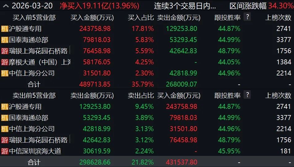 龙虎榜数据显示,3月18日至20日,源杰科技连续3个交易日内累计涨幅达到34.3%,期间上榜营业部席位合计净买入19.11亿元。具体来看,沪股通专用、国泰海通证券总部分别买入24.38亿元、7.98亿元,卖出12.93亿元、5.33亿元。