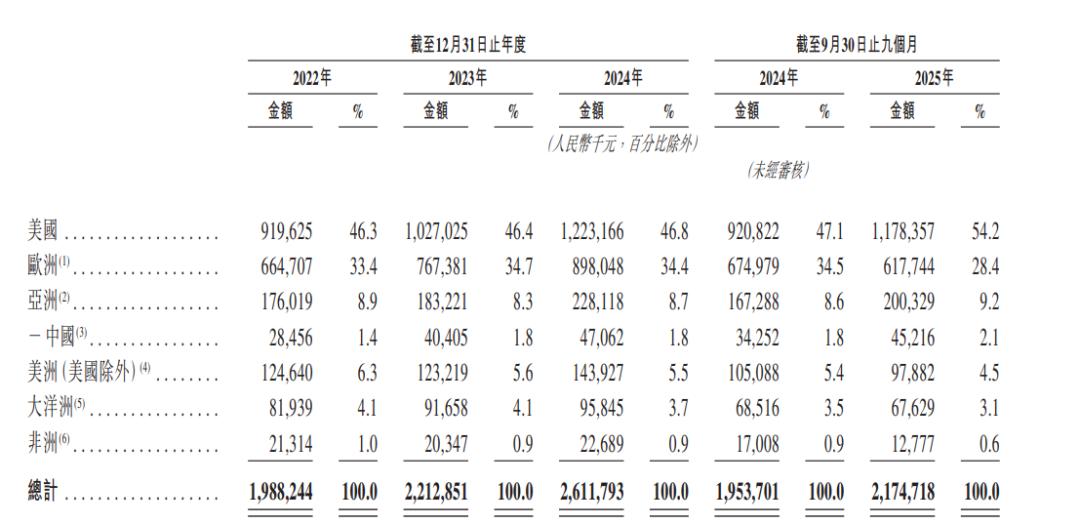 招股书显示,飞速创新已在美国、德国、澳大利亚、新加坡、英国及日本建立全球交付中心。2022年、2023年、2024年及2025年前三季度,飞速创新在海外市场的收入分别为19.60亿元、21.72亿元、25.65亿元及21.30亿元,分别占各期间总收入的98.6%、98.2%、98.2%及97.9%。