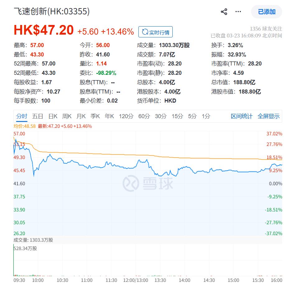 上市首日,飞速创新开盘价报56港元/股,高开34.62%。截至今日收盘,飞速创新报47.2港元/股,较发行价涨13.46%,总市值188.8亿港元。