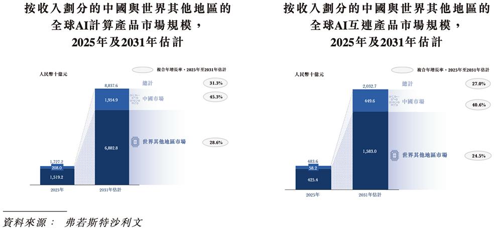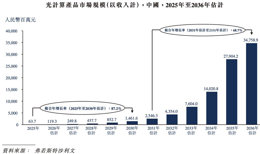 根据弗若斯特沙利文的资料,截至2025年,光计算芯片在中国AI推理芯片中的市场渗透率少于0.5%,预计到2040年将达到20%。到2031年,中国Scale-up光互连及光计算市场规模预计将分别达到2704亿元及25.46亿元。