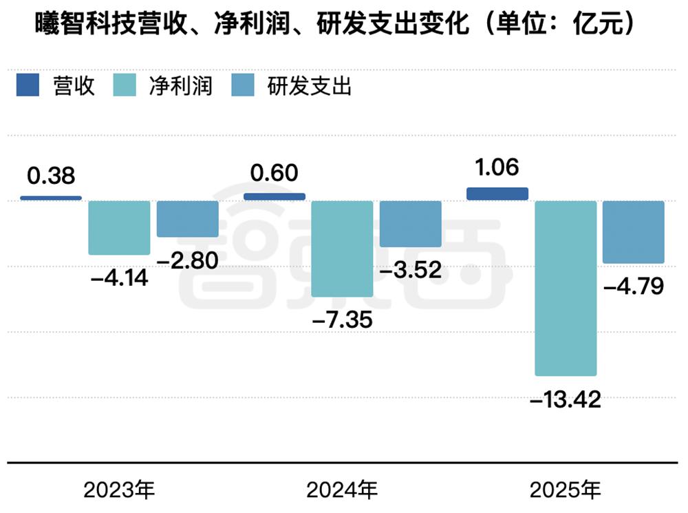 2023年、2024年、2025年,曦智科技收入分别为0.38亿元、0.60亿元、1.06亿元,净亏损分别为4.14亿元、7.35亿元、13.42亿元,研发费用分别为2.80亿元、3.52亿元、4.79亿元。