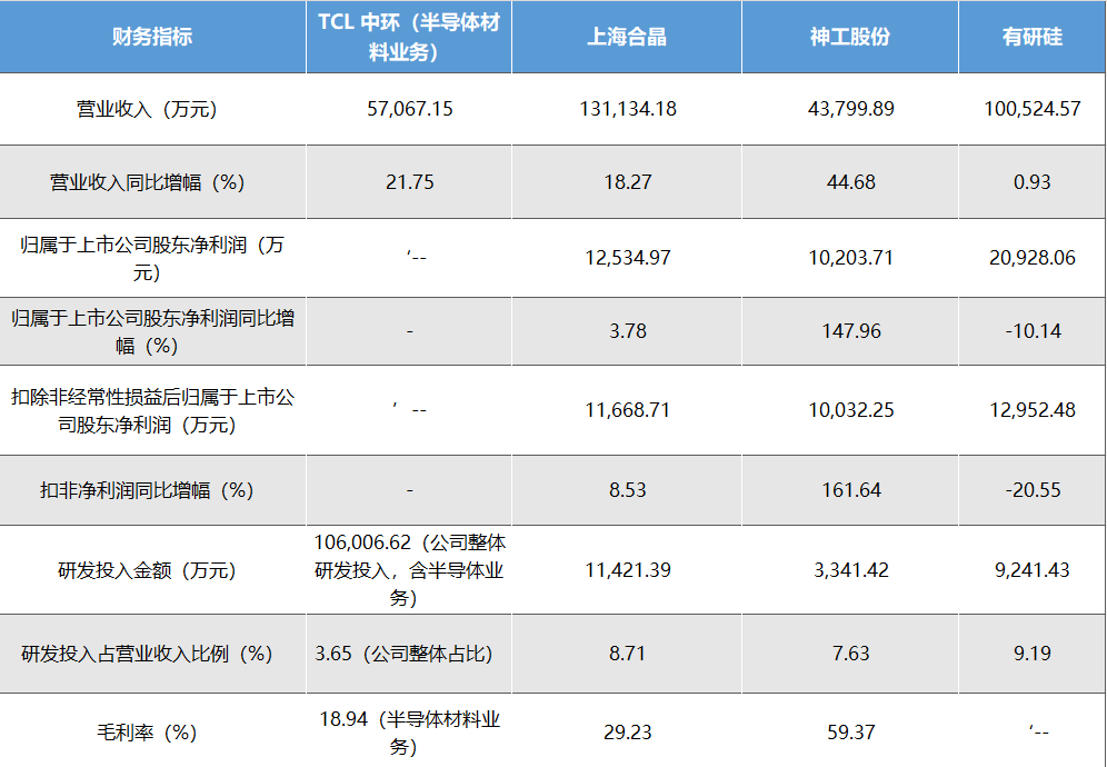 盈利表现方面,行业周期性特征和业务结构差异导致盈利水平分化显著。上海合晶和神工股份实现盈利增长,上海合晶归属于上市公司股东的净利润1.25亿元,同比增长3.78%,扣除非经常性损益后的净利润1.17亿元,同比增长 8.53%,核心产品硅外延片毛利率保持在 30.13% 的较高水平。神工股份归母净利润达1.02亿元,同比大幅增长147.96%,受益于下游需求回暖及规模效应显现,毛利率提升至59.37%,其中16英寸以上大直径硅材料毛利率高达 76.09%。有研硅则面临盈利压力,归母净利润2.09亿元,同比下降10.14%,扣非归母净利润1.30 亿元,同比降幅达20.55%,主要受行业竞争及产品结构调整影响。TCL中环半导体材料业务虽保持增长,但受行业整体环境影响,一定程度上影响了盈利表现,不过其半导体材料业务毛利率达18.94%,同比增长5.7个百分点,盈利能力稳步改善。