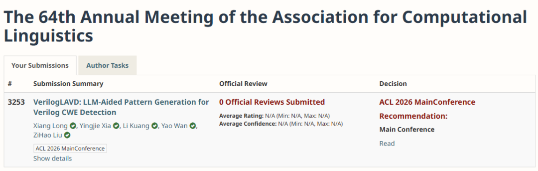 近日,杭州电子科技大学芯片与安全实验室(CSL)硕士生龙翔在导师夏莹杰教授指导下,与中南大学、华中科技大学等科研团队合作完成的研究成果"VerilogLAVD: LLM-Aided Pattern Generation for Verilog CWE Detection"被The 64th Annual Meeting of the Association for Computational Linguistics(ACL'26,CCF-A类会议)主会录用。实验室硕士生龙翔为论文第一作者,夏莹杰教授为通讯作者。