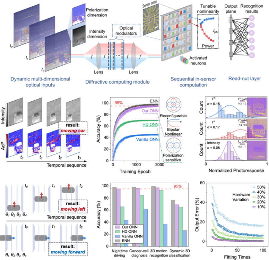 研究团队将SPU接入光神经网络前端,构建端到端混合光电视觉架构,在视野受限任务中同时处理连续帧的强度信息和偏振信息。结果表明,基于SPU的系统在目标识别性能上显著优于传统光学方案,并接近先进电子神经网络水平。夜间场景是这一能力的重要验证场景之一。