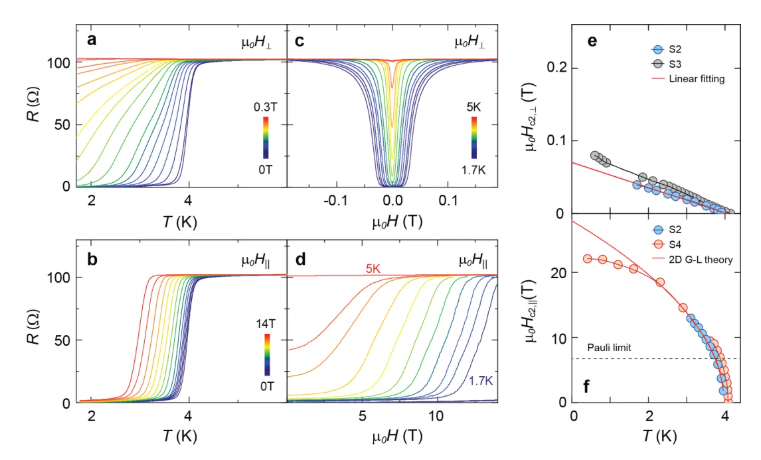 在传统超导体中,库珀对遵循BCS理论,处于自旋单态,其上临界磁场受限于泡利顺磁极限。一旦外加磁场超过这一极限,自旋反向的电子对便会因塞曼效应而破裂。而在伊辛型超导体中,由于空间反演对称性破缺,自旋轨道耦合相互作用将电子的自旋锁定在面外方向,从而赋予库珀对抵御面内强磁场的能力。此前,这一特性仅在过渡金属硫化物(如MoS₂、NbSe₂)或锡烯等含重元素的二维体系中被观测到。