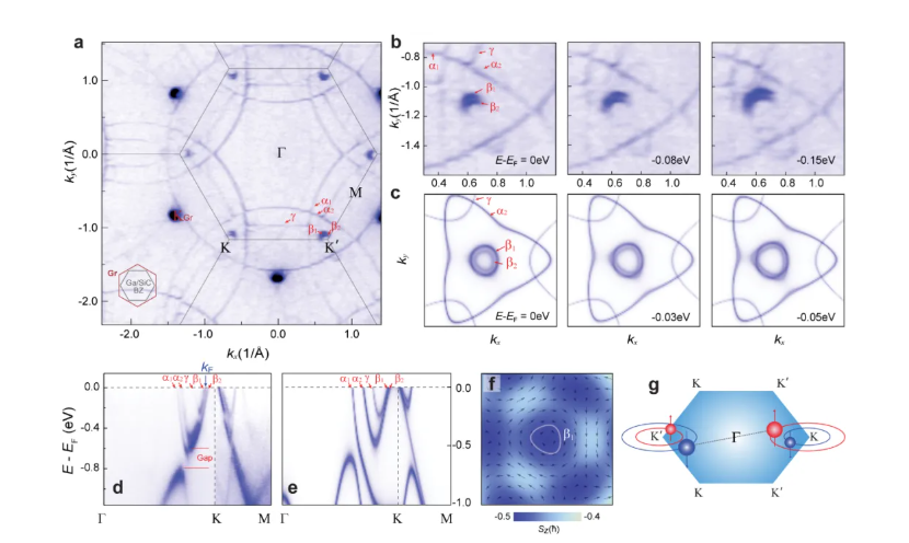 图3: 石墨烯/三层镓/碳化硅异质结中具有劈裂费米面和伊辛型自旋织构的特征