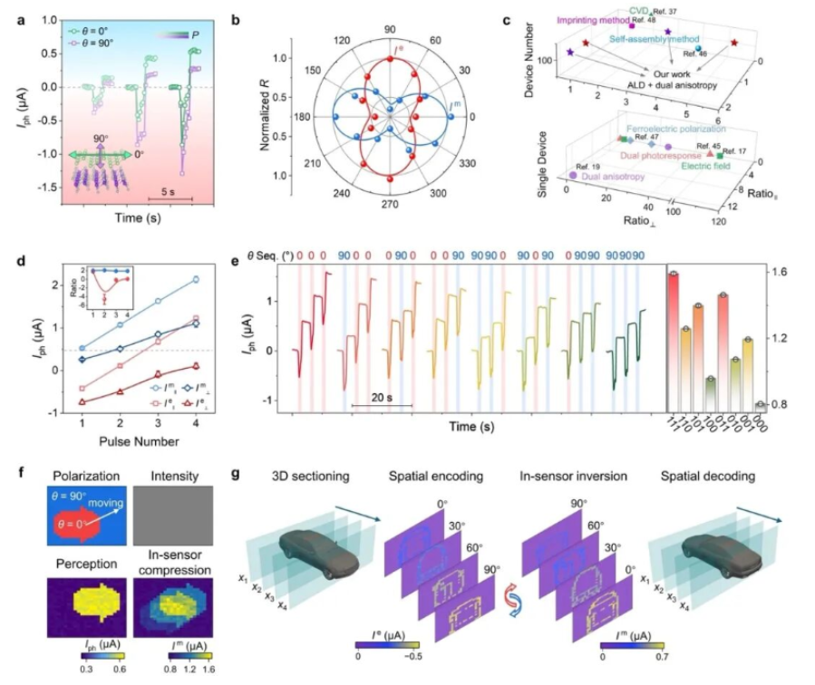 传感器阵列在不同角度偏振光激发下呈现多种响应模式,实现全光学自重构,为高维特征提取提供物理基础。