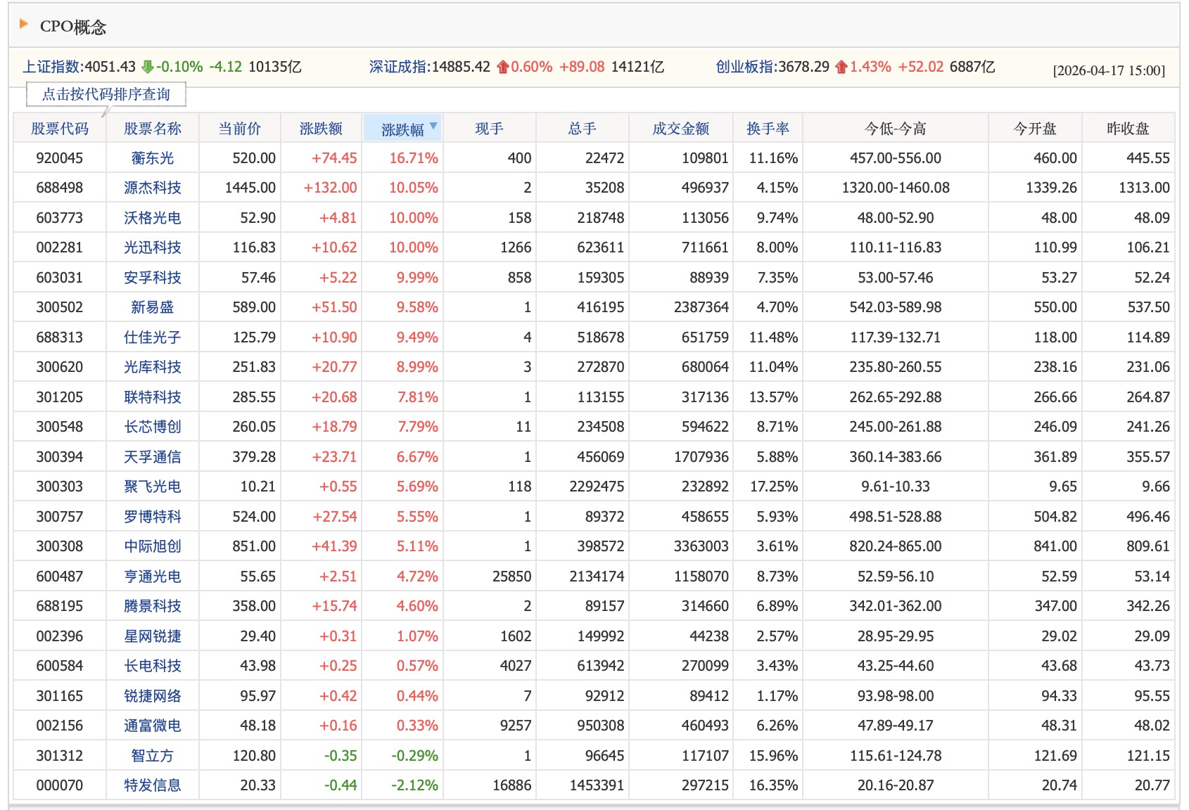 均胜电子4月14日新增CPO概念,子公司宁波均胜光电子出资3000万元投资新菲光通信,持股13.62%为第二大股东,依托光电子产业基础切入CPO领域。