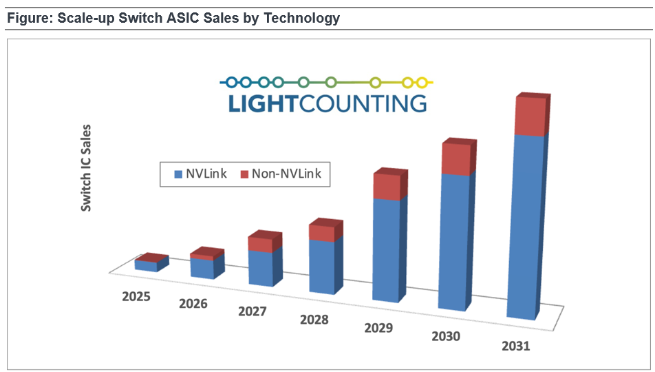 尽管英伟达的NVLink交换机仍占据未来市场的大部分份额,但LightCounting预计从2026年开始,包括UALink和ESUN在内的替代方案将出现可观的商用市场。总体而言,LightCounting预测Scale-Up交换机ASIC的复合年增长率为53%。