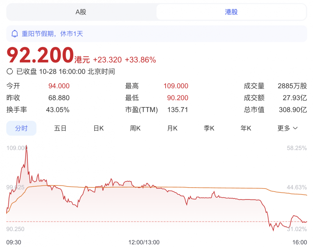 港股上市首日,剑桥科技开盘即呈现高开态势,开盘价为94.00港元/股,较发行价上涨36.47%。盘中一度上涨58.25%至109港元/股,最终收盘价为92.2港元/股。