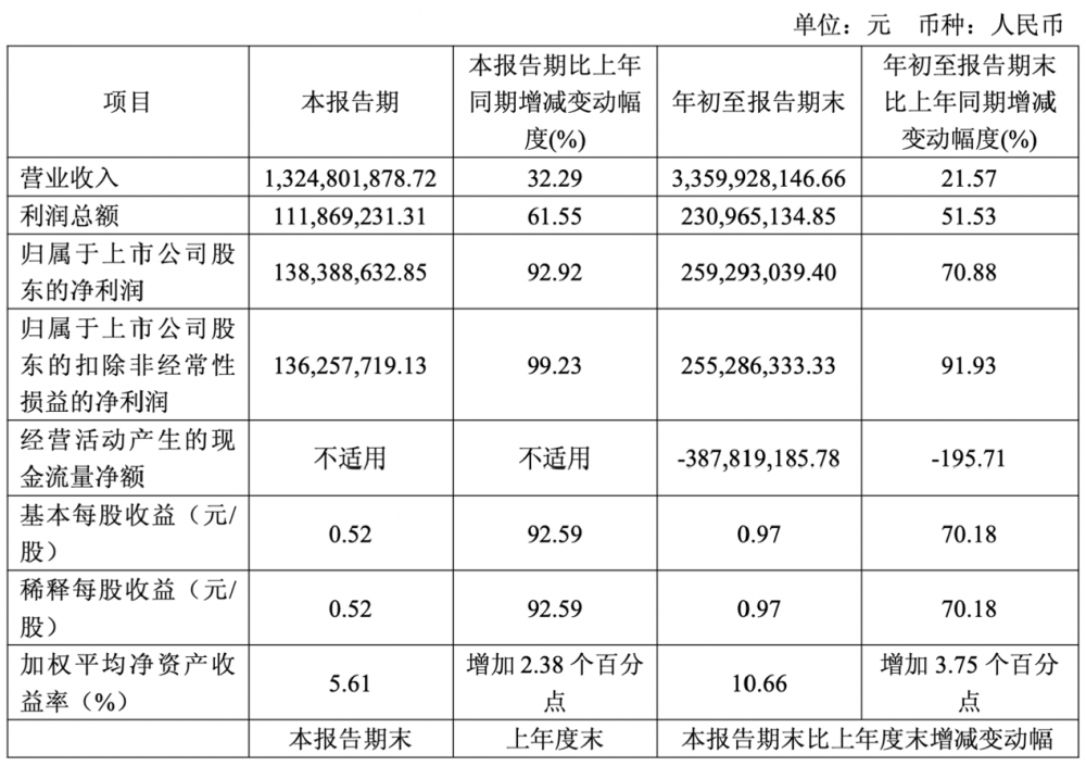 2025年前三季度,剑桥科技实现营收33.60亿元,同比增长21.57%;归属于上市公司股东的净利润2.59亿元,同比增长70.88%;扣非净利润2.55亿元,同比增长91.93%。本报告期及年初至报告期末,基本每股收益同步增长均超70%。