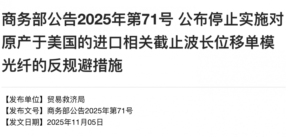 近日,商务部公告2025年第71号公布停止实施对原产于美国的进口相关截止波长位移单模光纤的反规避措施。