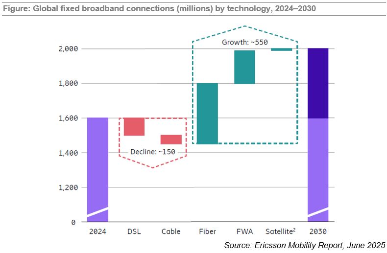 2025年,运营商正式启动5G-A网络部署,同时产业界加速推进6G技术研究。另外,通过移动网络提供的固定无线接入(FWA)服务已覆盖全球近500家运营商,与FTTH形成日益激烈的竞争。同时,FWA流量激增为移动回传市场带来利好,推动回传容量升级需求。