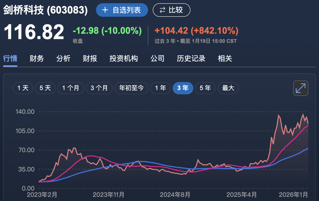 这看似亮眼的成绩,资本市场并不买账。周一开盘,剑桥科技A股开盘跌停,随后重复着“跌停、开板、跌停……”,最终跌停收场,收盘价116.82元/股,市值411.97亿元,全天成交额超34亿元,换手率超10%。另外,剑桥科技H股一度跌超12%。