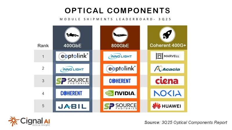 “2025年第三季度,400G及以上速率的数通光模块出货量首次突破1000万只,营收超过50亿美元。”Cignal AI首席分析师 Dr. Scott T. Wilkinson表示,下一阶段的增长引擎将是1.6T光模块和用于多场景扩展的相干光模块,目前Ciena、思科/Acacia和诺基亚已开始向Meta等客户交付800ZR+模块。