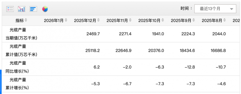 国家统计局数据显示,2025年,国内光缆产量累计达到2.51亿芯千米,光缆产量累计下降5.3%。相较2024年光缆产量累计下降18.2%的数字,2025年虽仍在下降,但降幅大幅收窄。另外,2025年12月,光缆产量同比增长6.2%,环比增长8.7%。